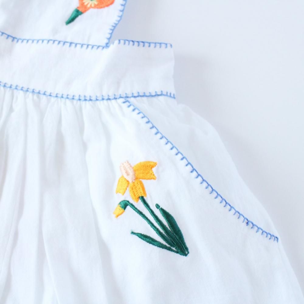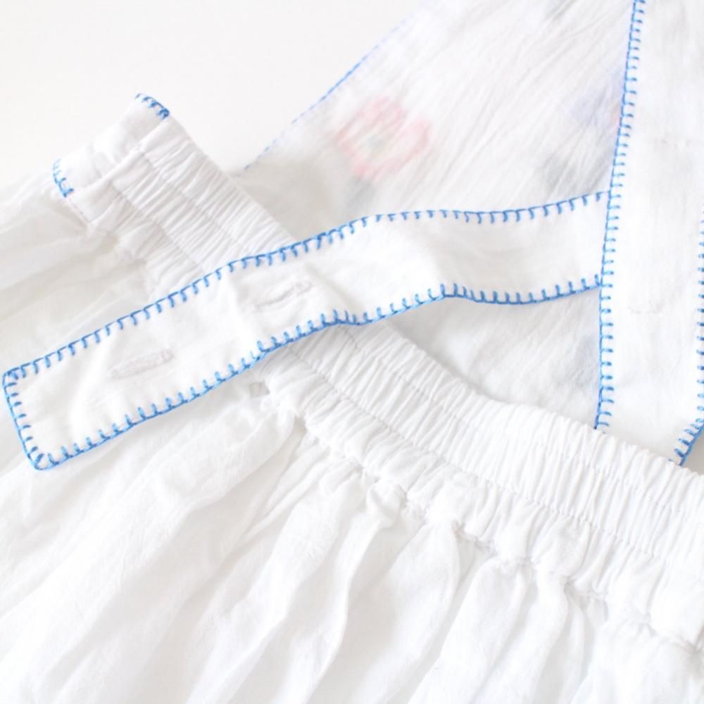 白地に鮮やかな花柄の刺繍と、ブルーのブランケットステッチがアクセントになったピナフォアドレス。スカート部分のみ裏地付きです。