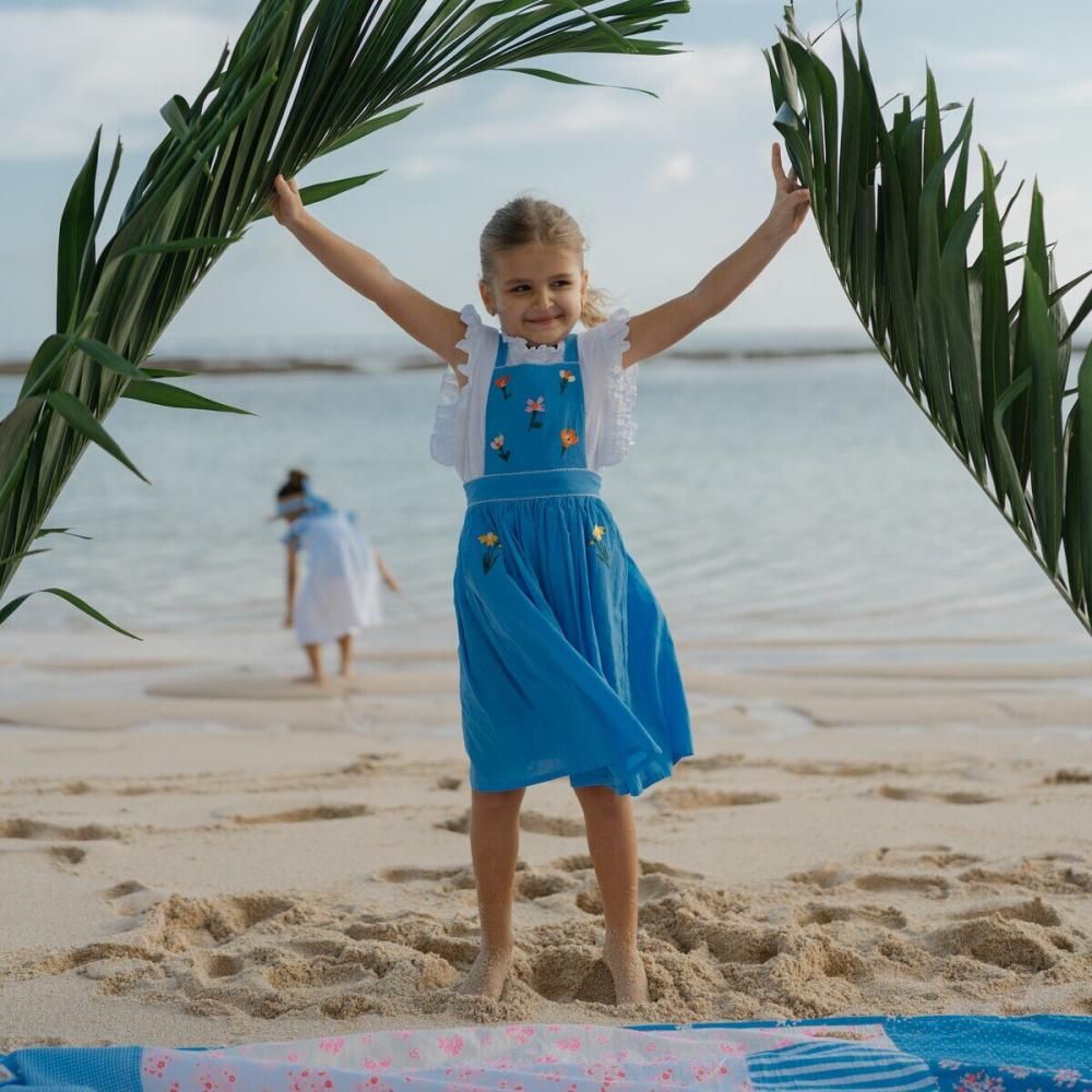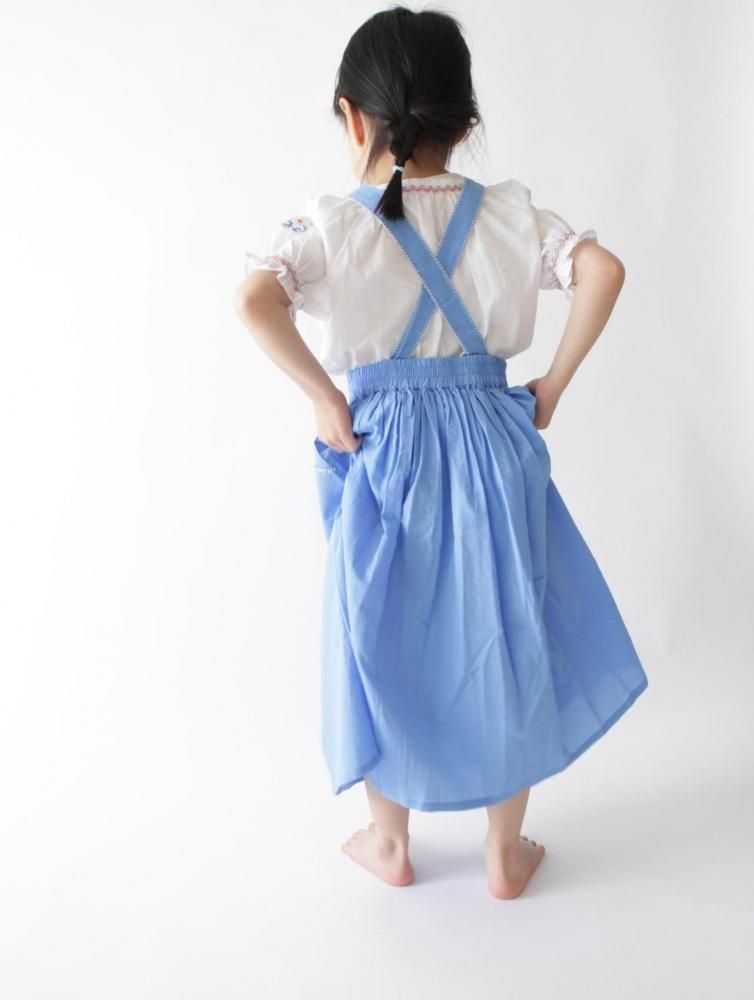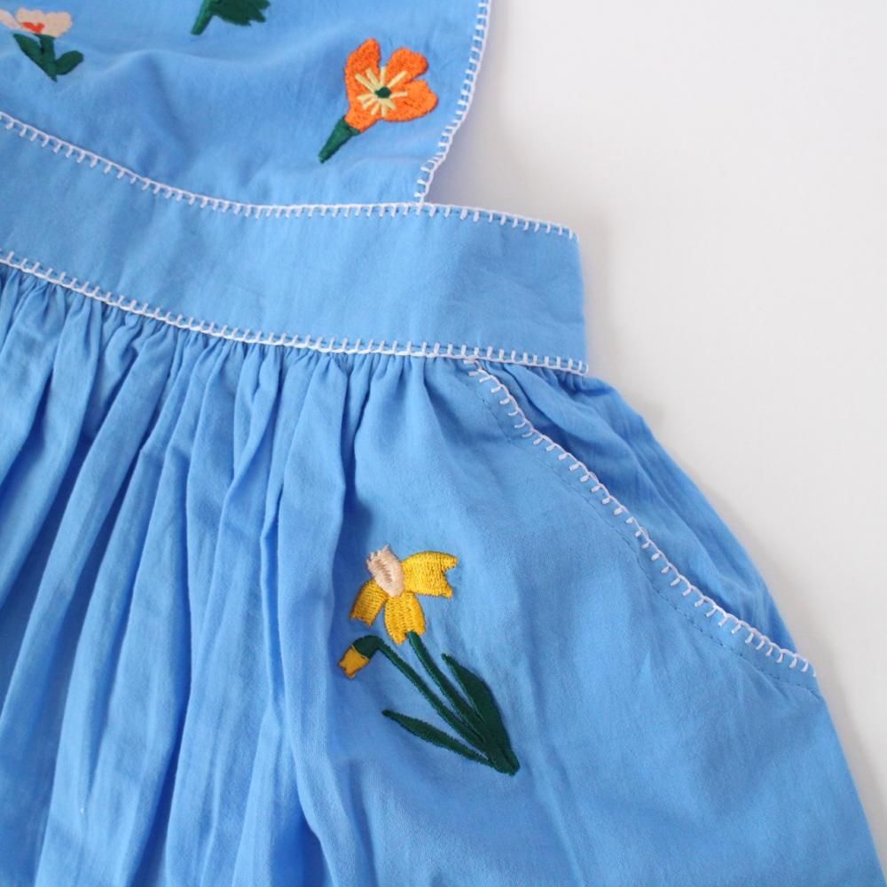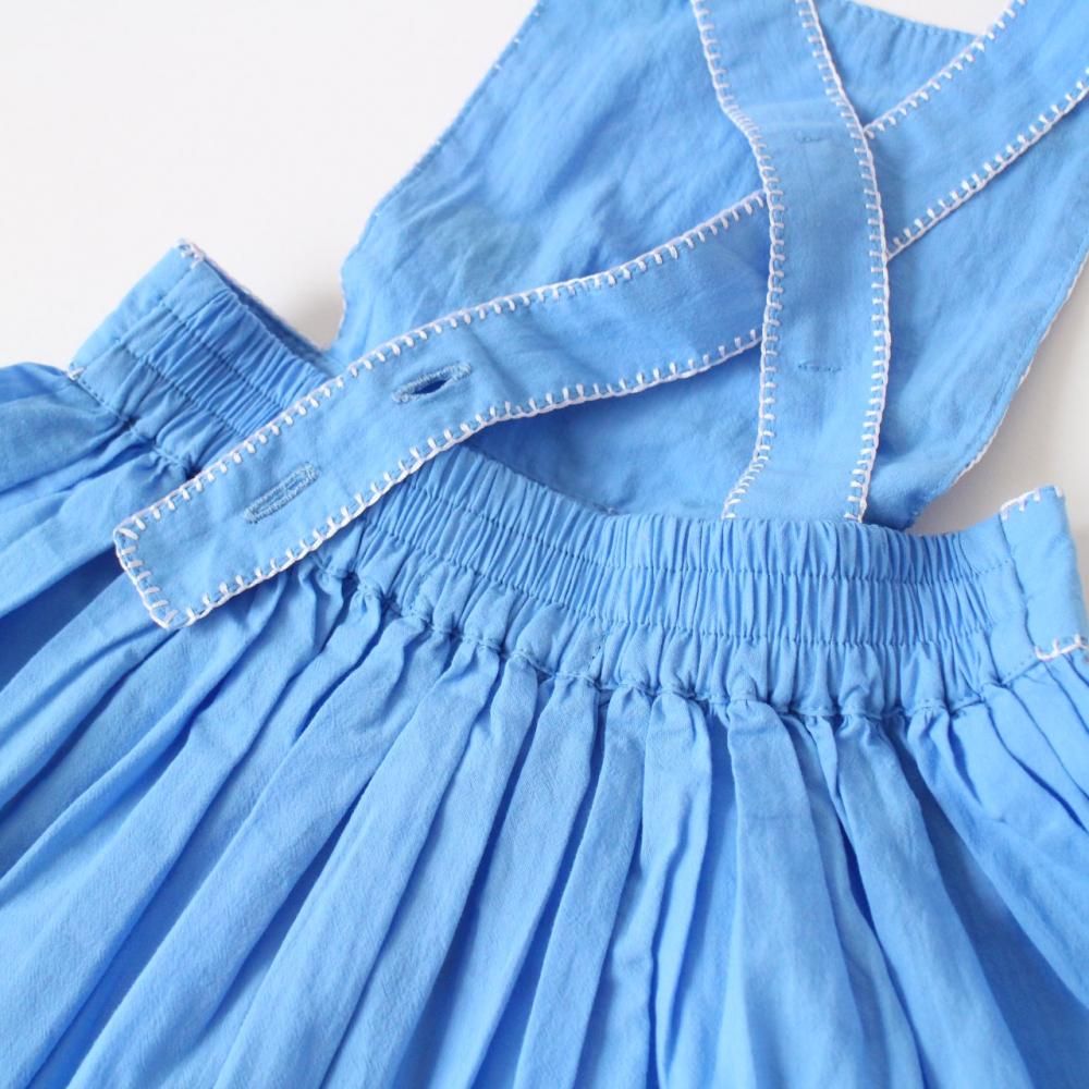ブルー地に鮮やかな花柄の刺繍と、ホワイトのブランケットステッチがアクセントになったピナフォアドレス。ショルダーストラップはバッククロス仕様。ボタン位置でお好みの丈の長さに調節できます。