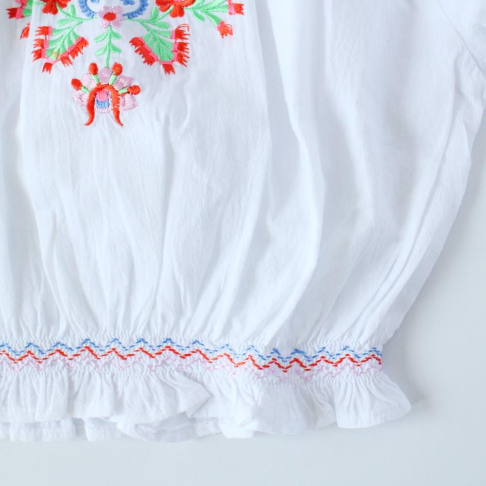 エスニックテイストの刺繍が施されたブラウスは、パフスリーブ仕様で着用時のシルエットが可愛い1着。着脱時に便利なフロントボタン付き。