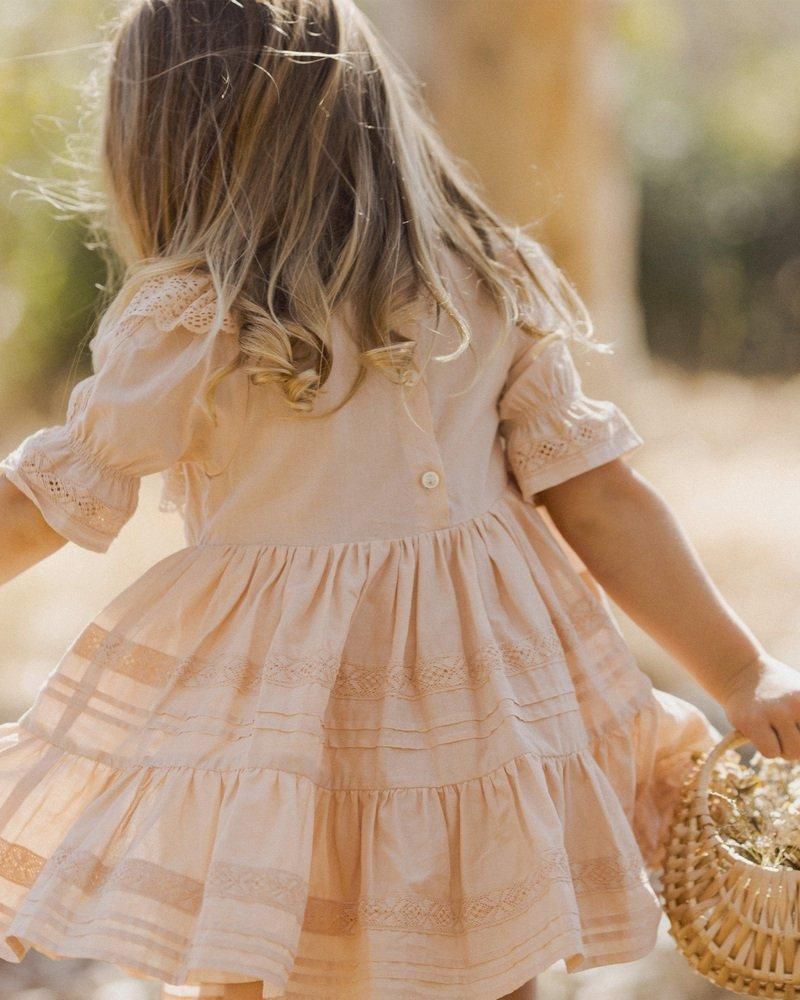 アンティーク調のくすみカラーのワンピース。胸元にレースのディテール、スカートにピンタックのディテールが施され、後ろは簡単にボタンで開閉できます。フォーマルなシーンだけでなく、特別な日のお出かけにもおすすめのアイテムです。スカート部分裏地付き。