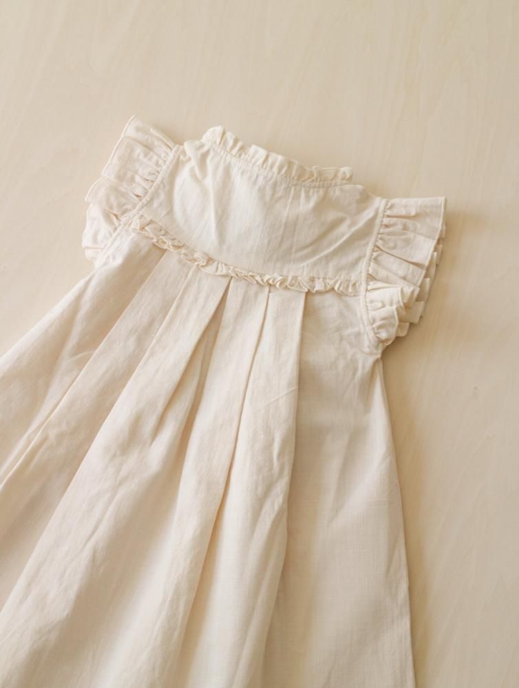 ミディアム丈の生成りのワンピースは、袖口のフリルと胸元のレースがナチュラルな可愛らしさ。生地をふんだんに使い、タックプリーツを幅広にとっているのでボリューム感があり、着用した時に胸下から自然に広がりを見せてくれます。