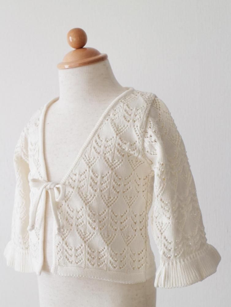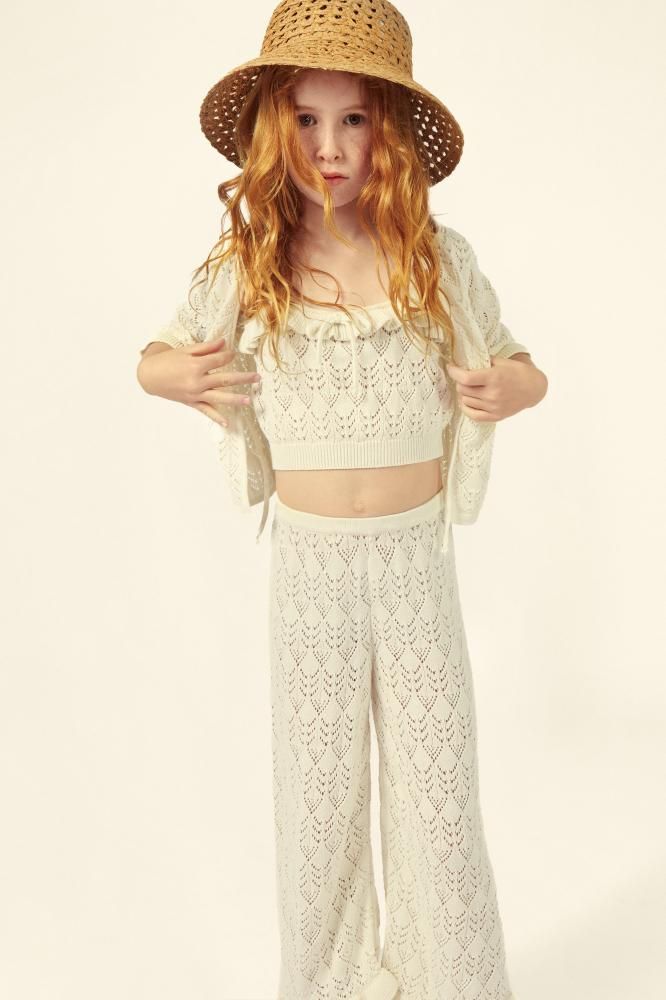 ショート丈のカーディガンは、フリルのような袖口や胸元で結ぶリボンなど、上品さが詰まった1着。デニムと合わせてラフに着たり、おそろいのパンツとのコーディネートもおすすめです。