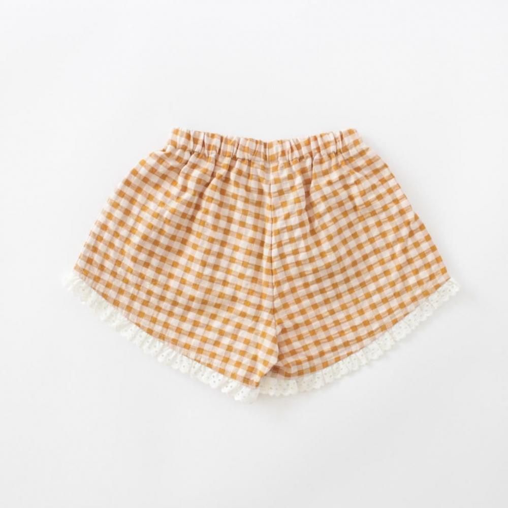 裾のレースがアクセントのキャラメルカラーのショートパンツ。おそろいカラーのブラウスとのコーディネートがおすすめです