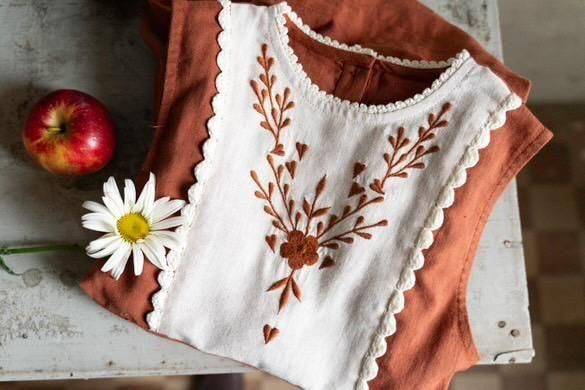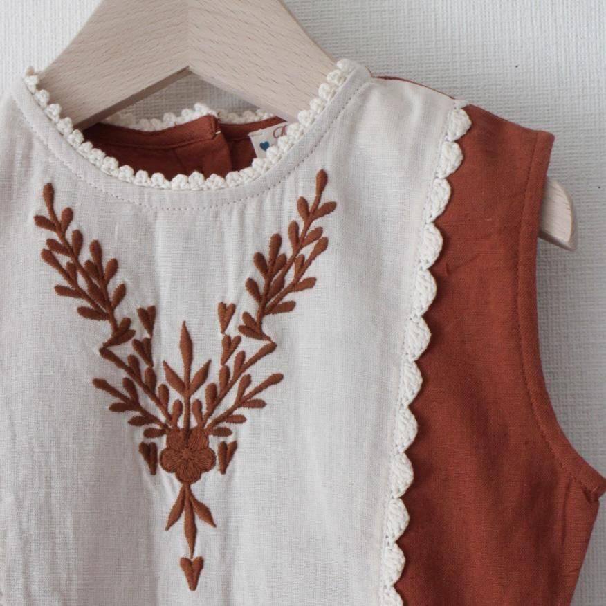 花の刺繍や手編みのかぎ針編みのふちどりが華やかな、キャラメルカラーのワンピース。