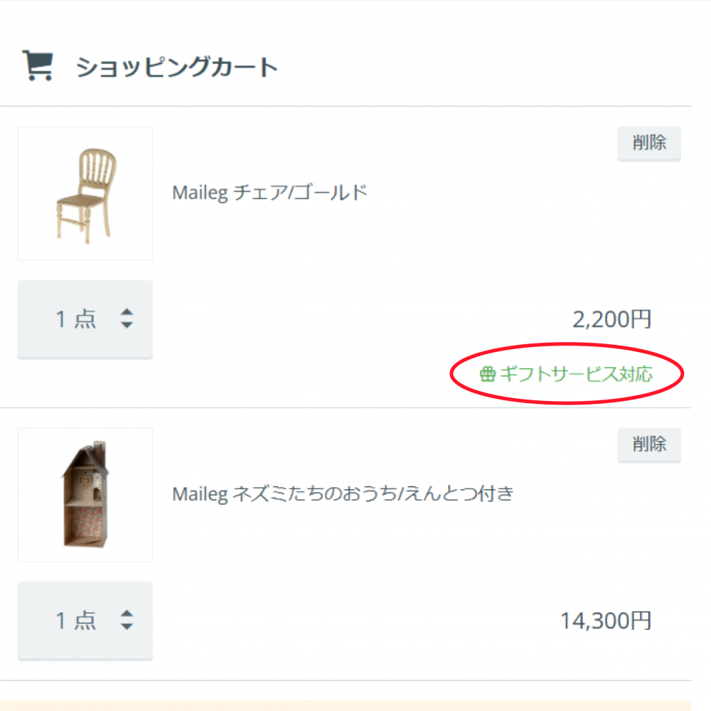 カート画面で「ギフトサービス対応」と表示のある商品がラッピング対象となります。(写真4枚目)また、大型商品など一部ラッピング対象外の商品がございます。