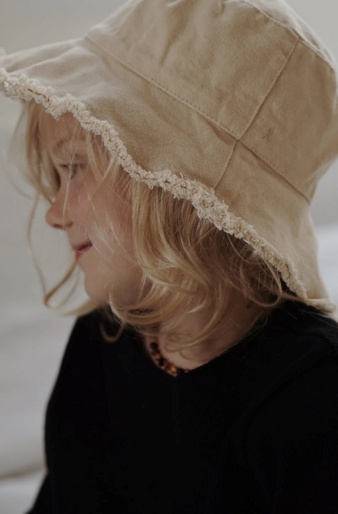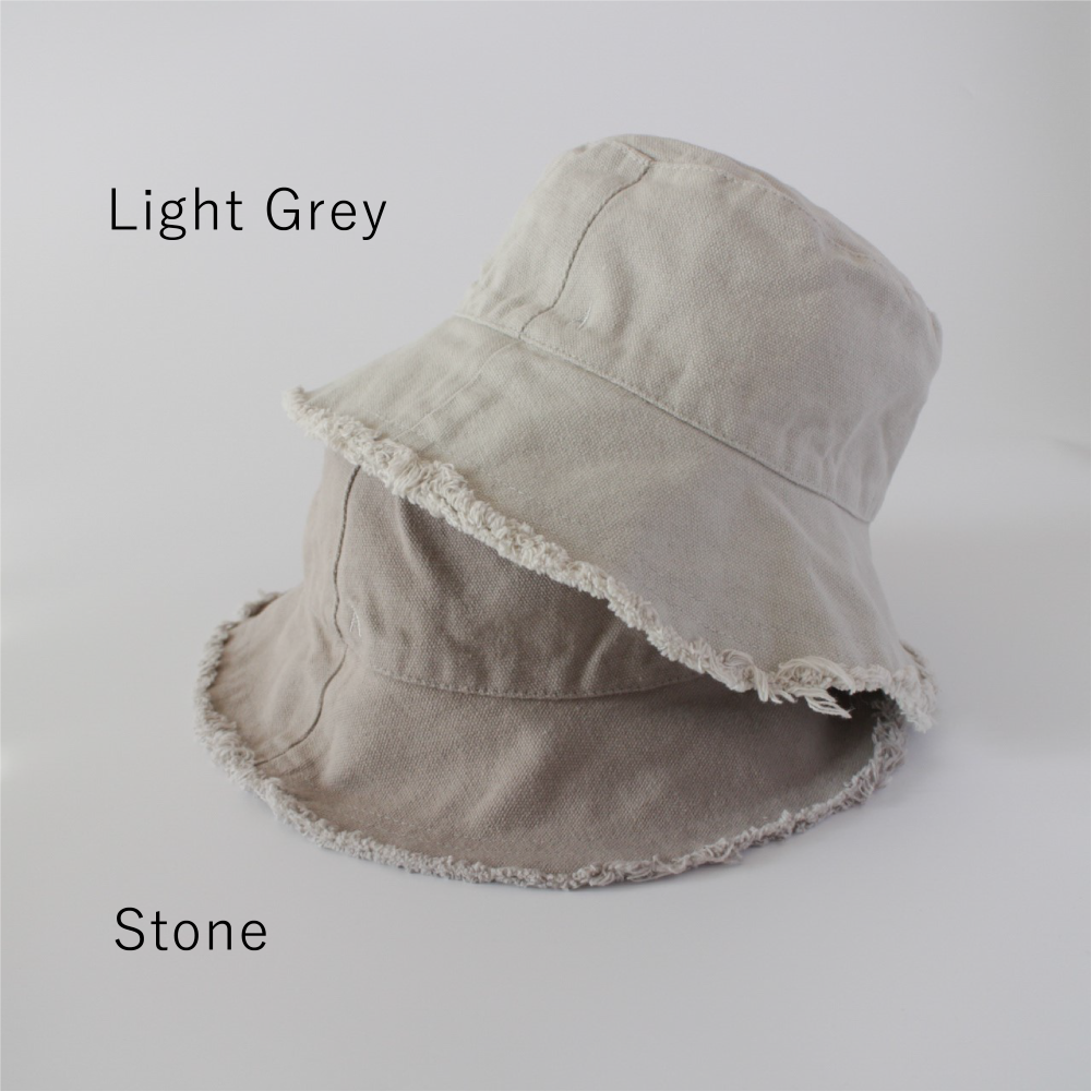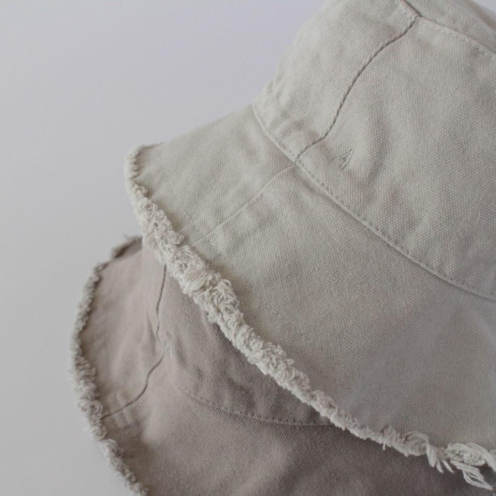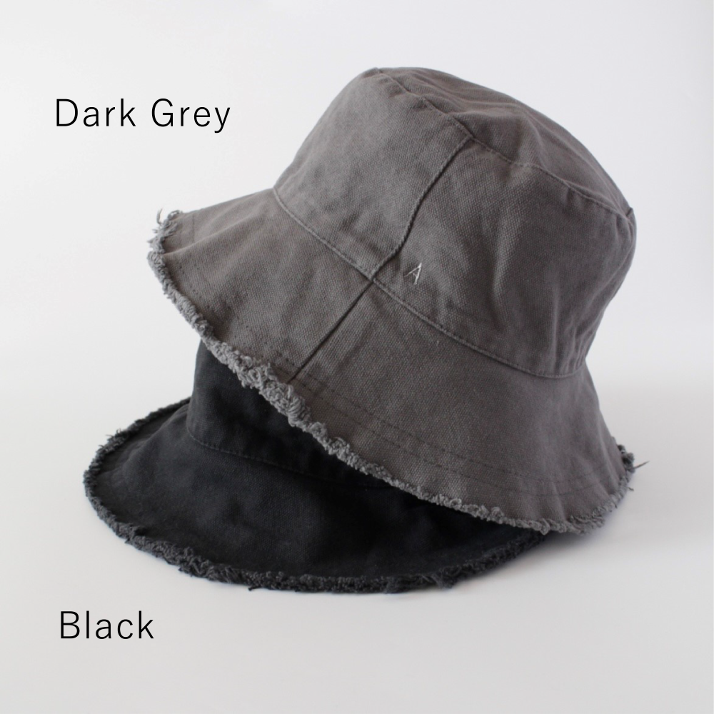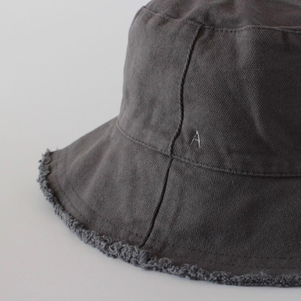 ブリムエッジにほつれ加工が施されたキャンバス地のバケットハット。ヴィンテージのようなこなれ感のあるカラーラインナップ。生地と同色のAのロゴ刺繍もポイントです。