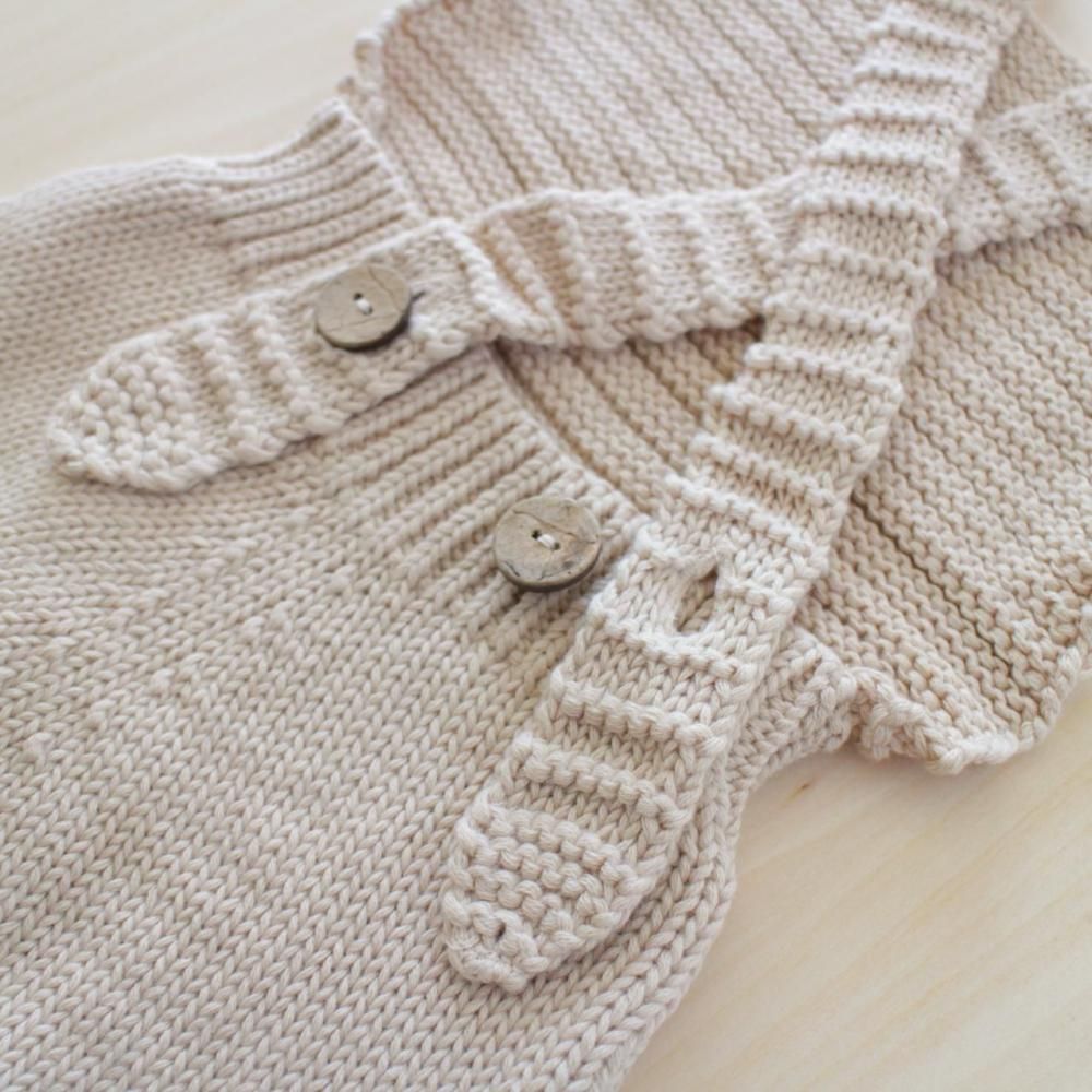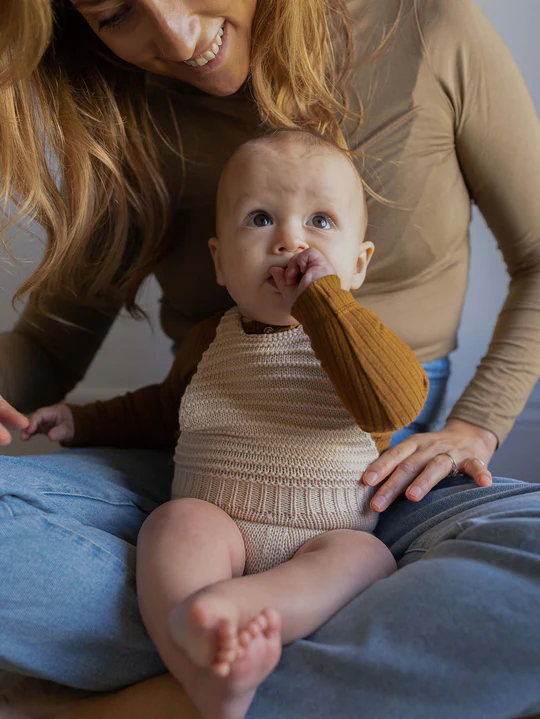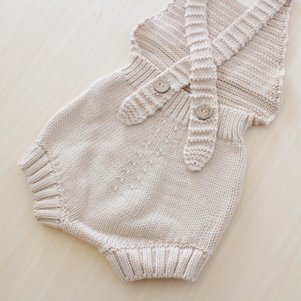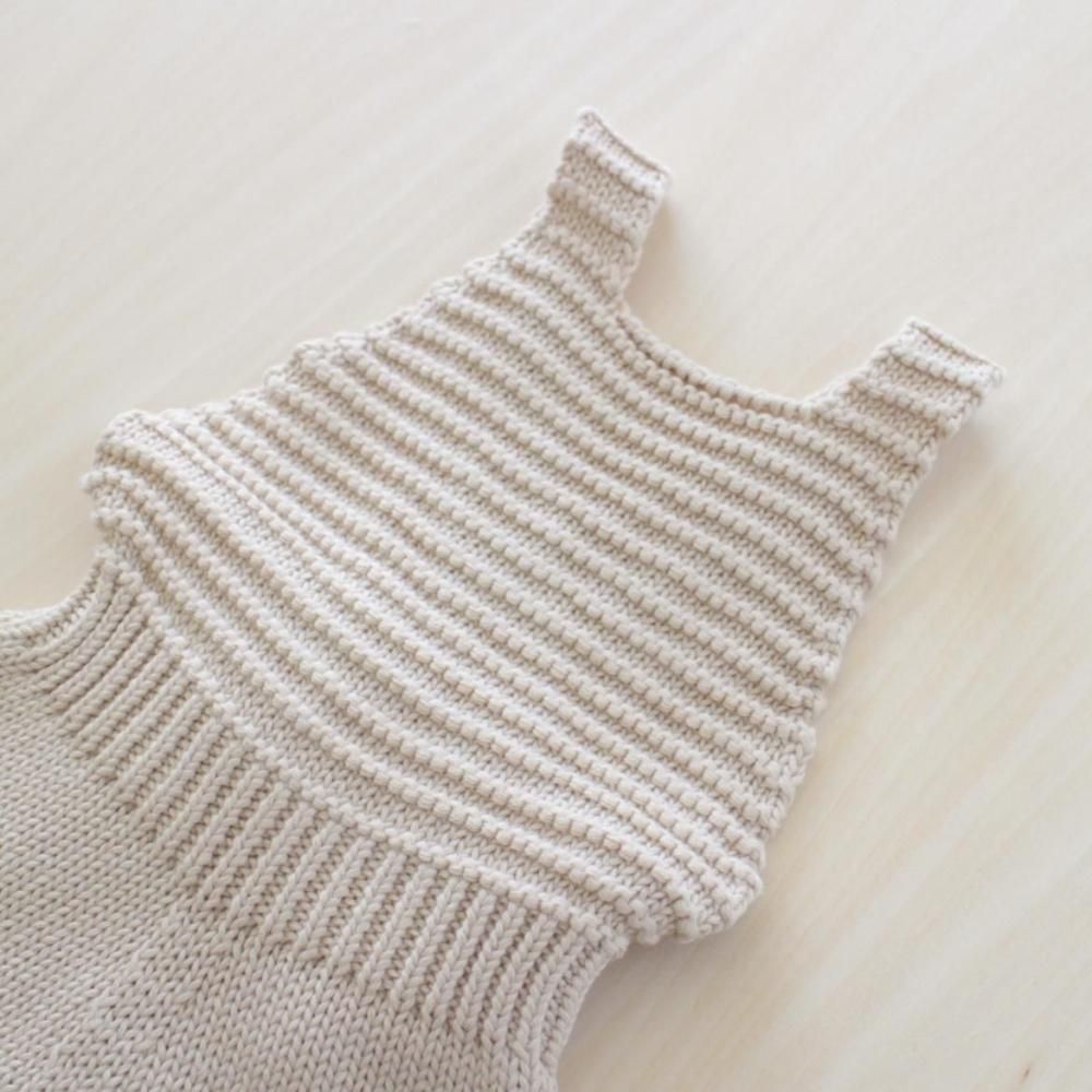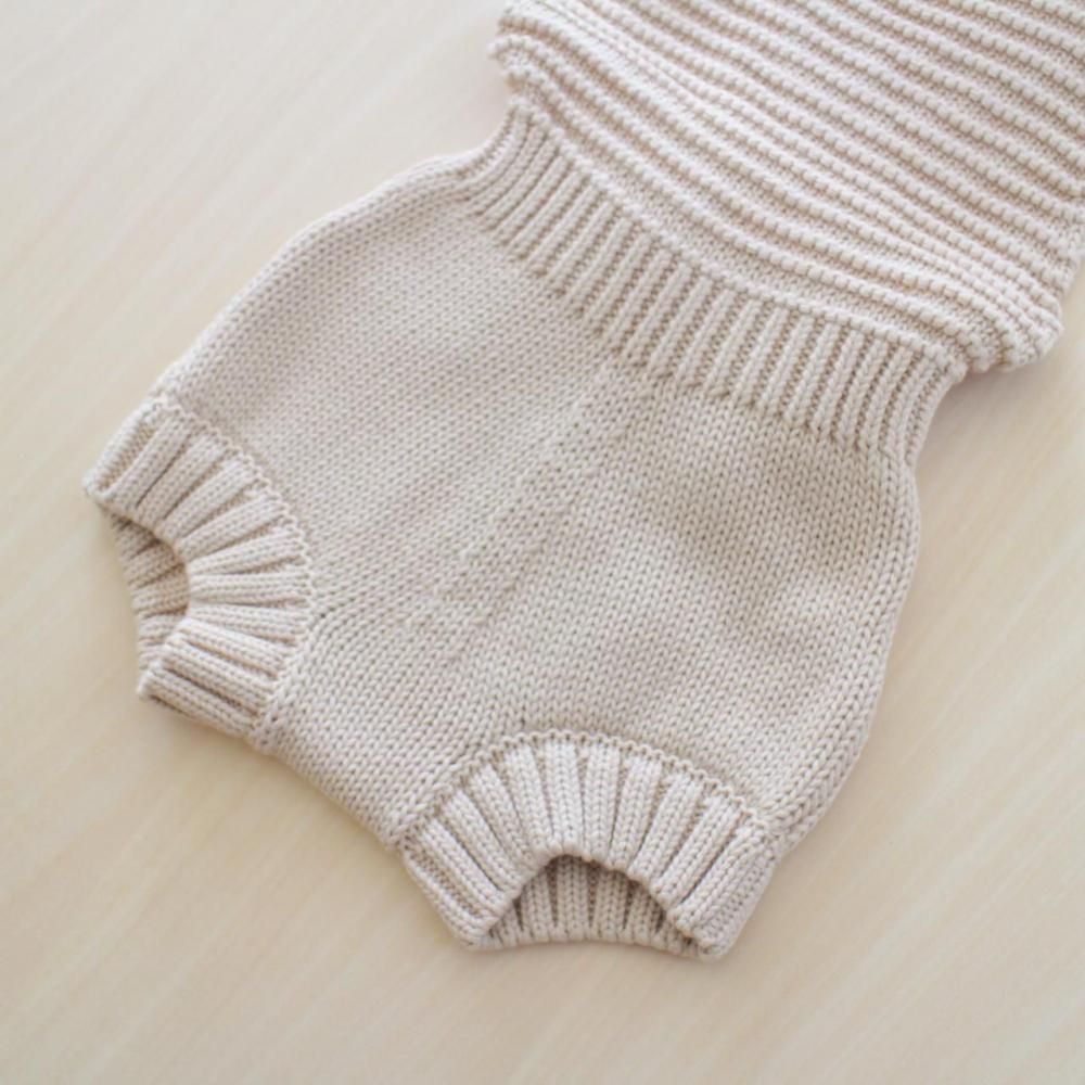 オートミールカラーのベビー用のニットロンパース。オーガニックコットンの柔らかなニット生地は肌触りがとても滑らかです。