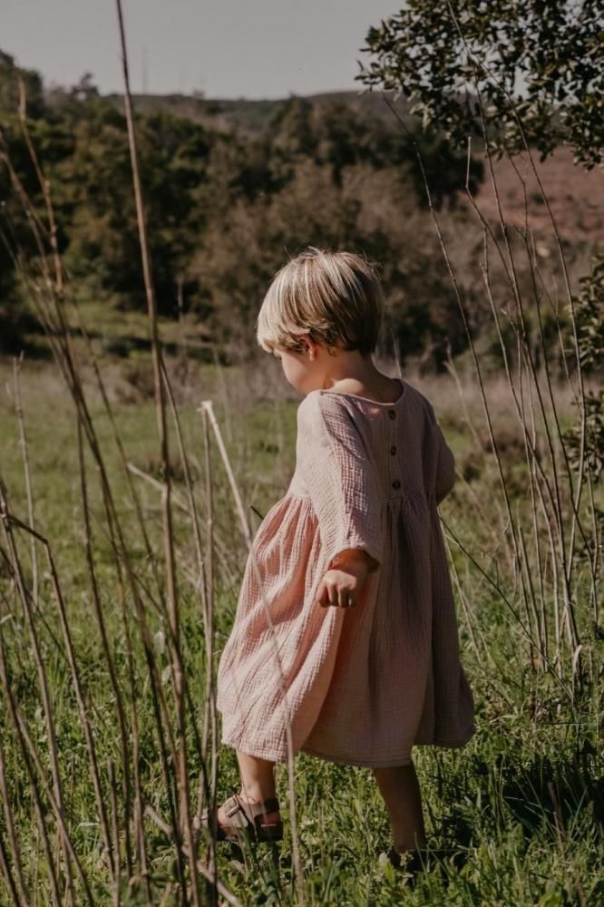 オーガニックコットンモスリン生地を使用した肌触りの良いワンピース。アンティークローズのくすみカラーがナチュラルな雰囲気を演出します。ゆったりとしたお作りです。