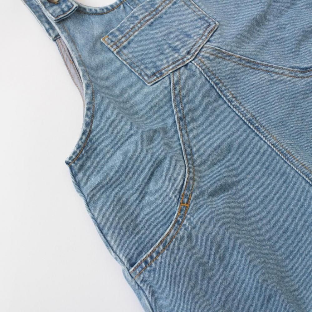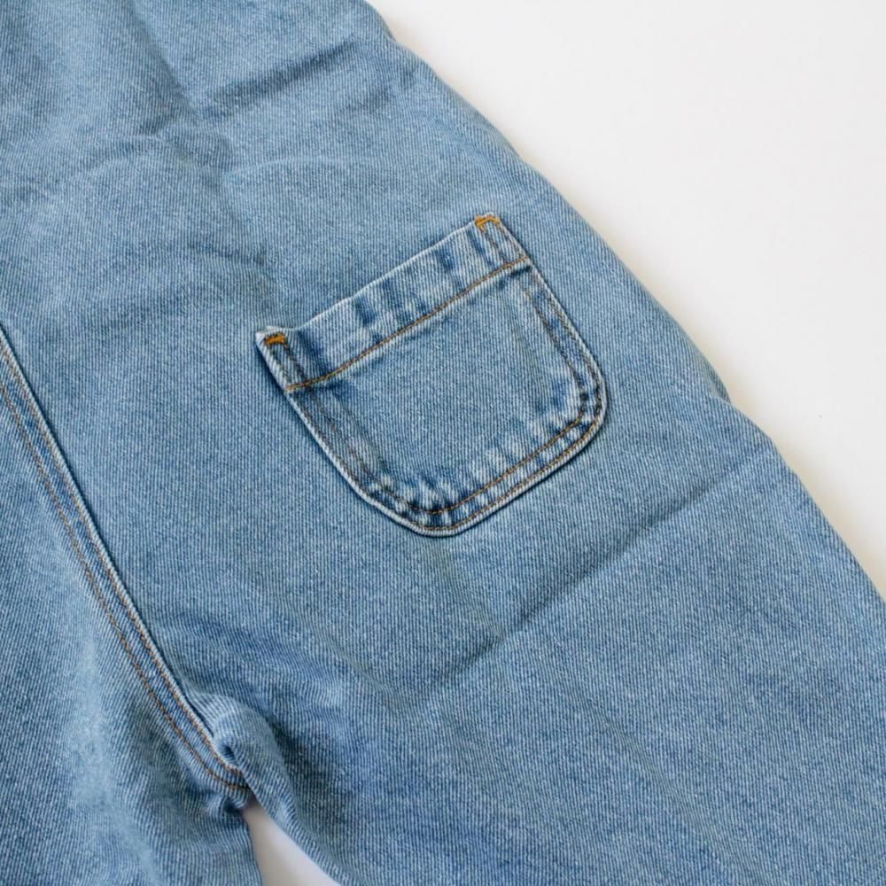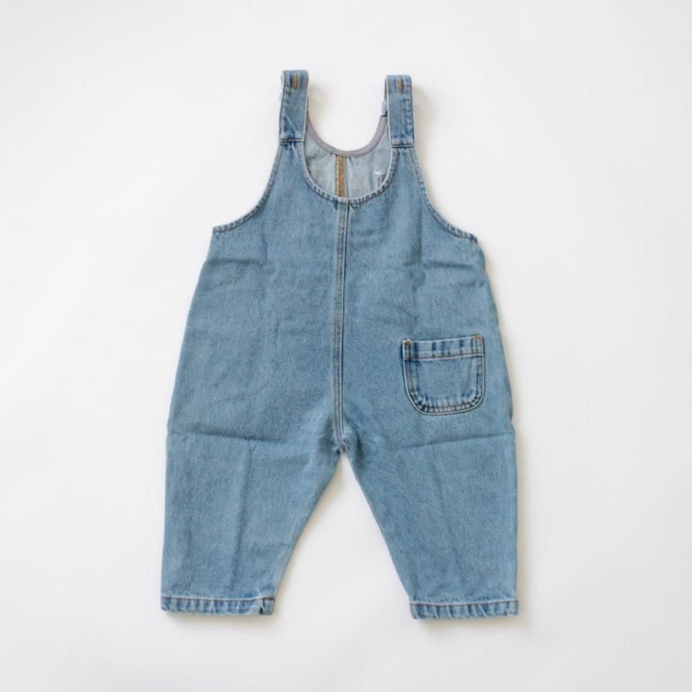 OEKO-TEX STANDARD100の認証を受けたオーガニックコットンのデニム生地を使用たオバーオール。ブラウンのステッチがアクセント。バックスタイルはパッチポケットが1つ付いています。