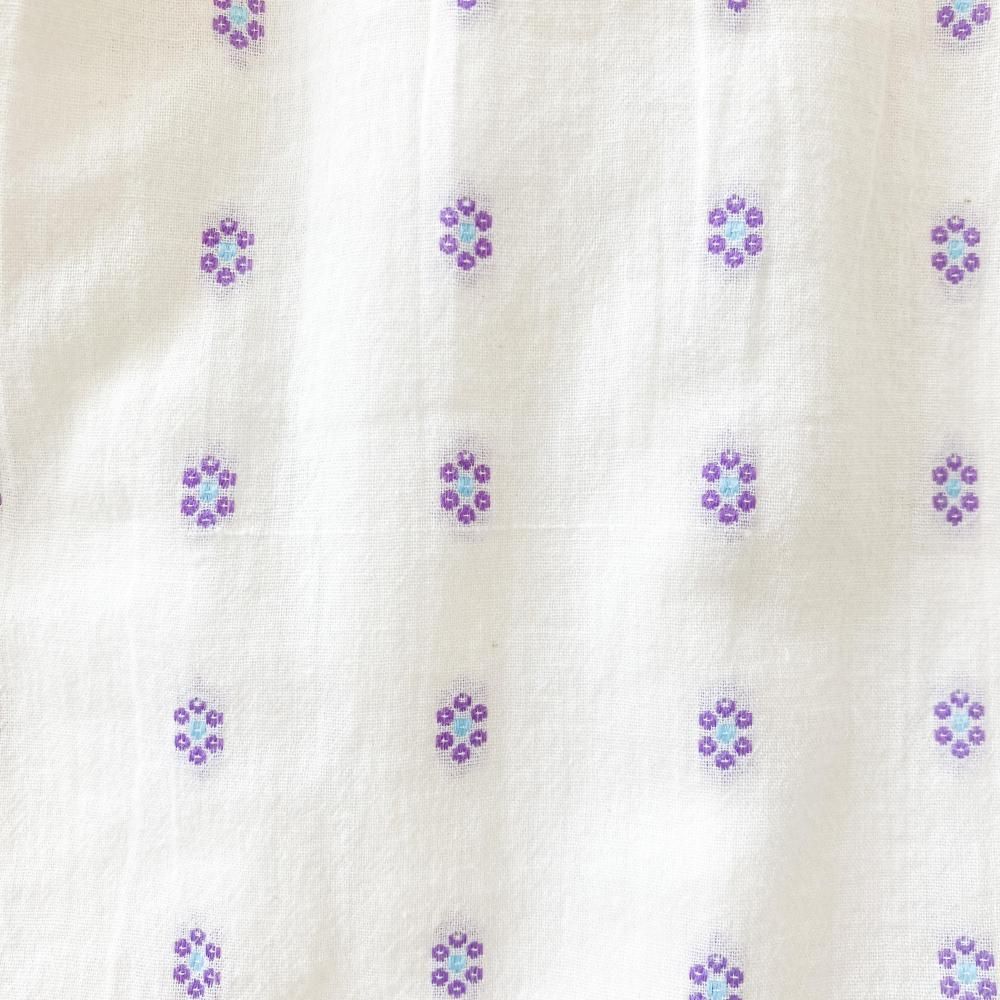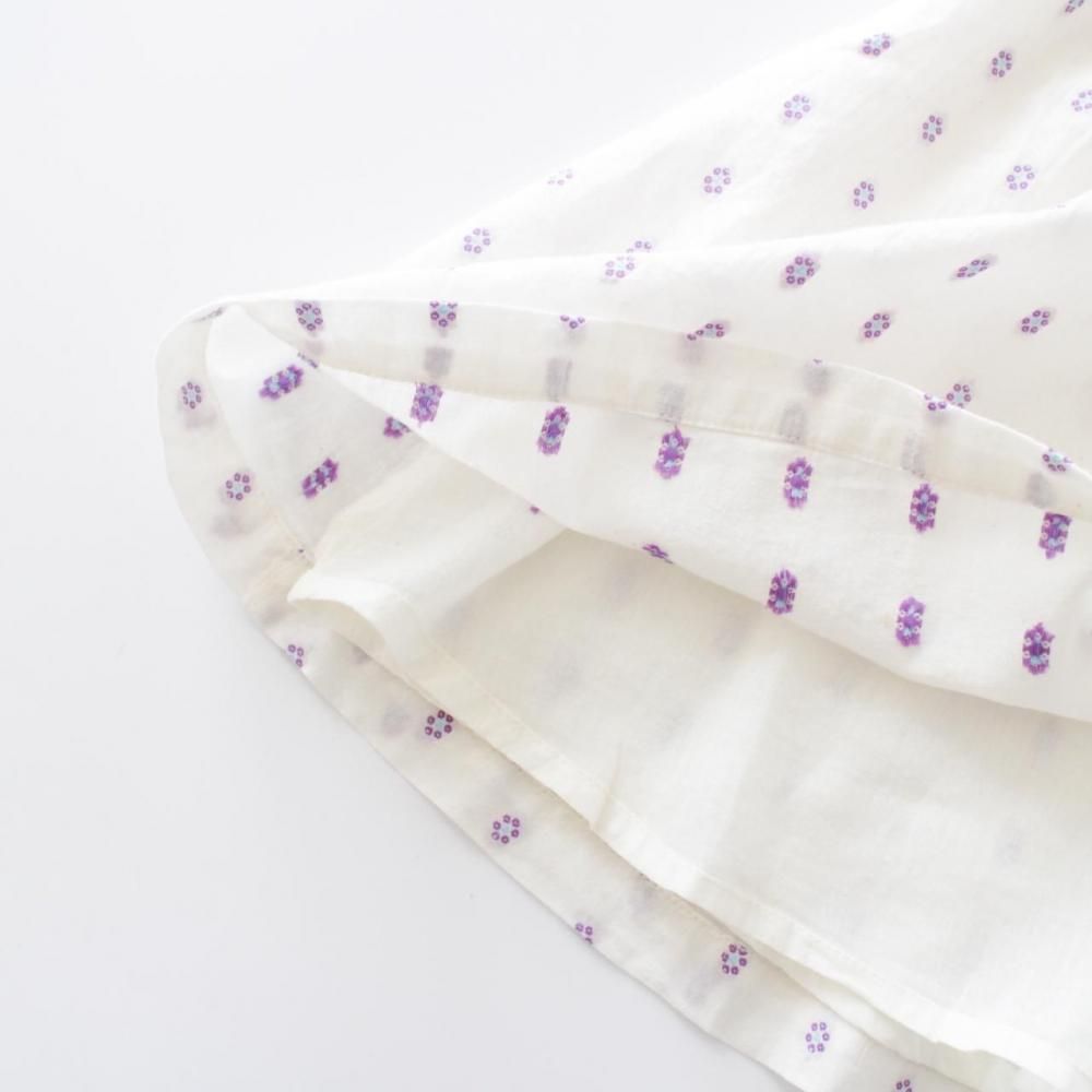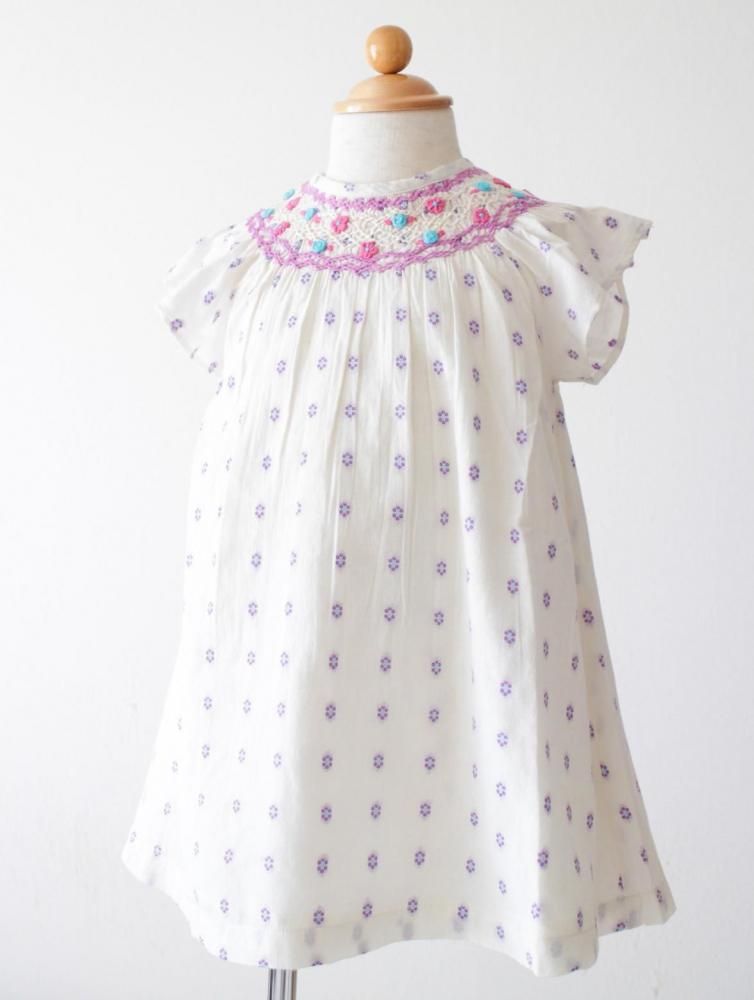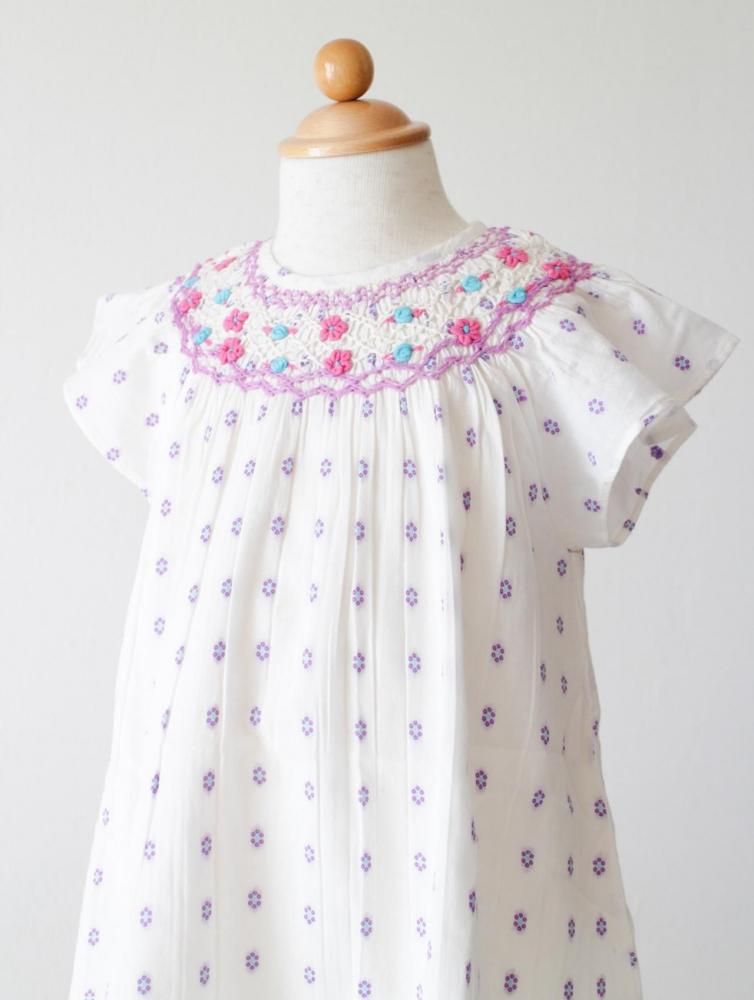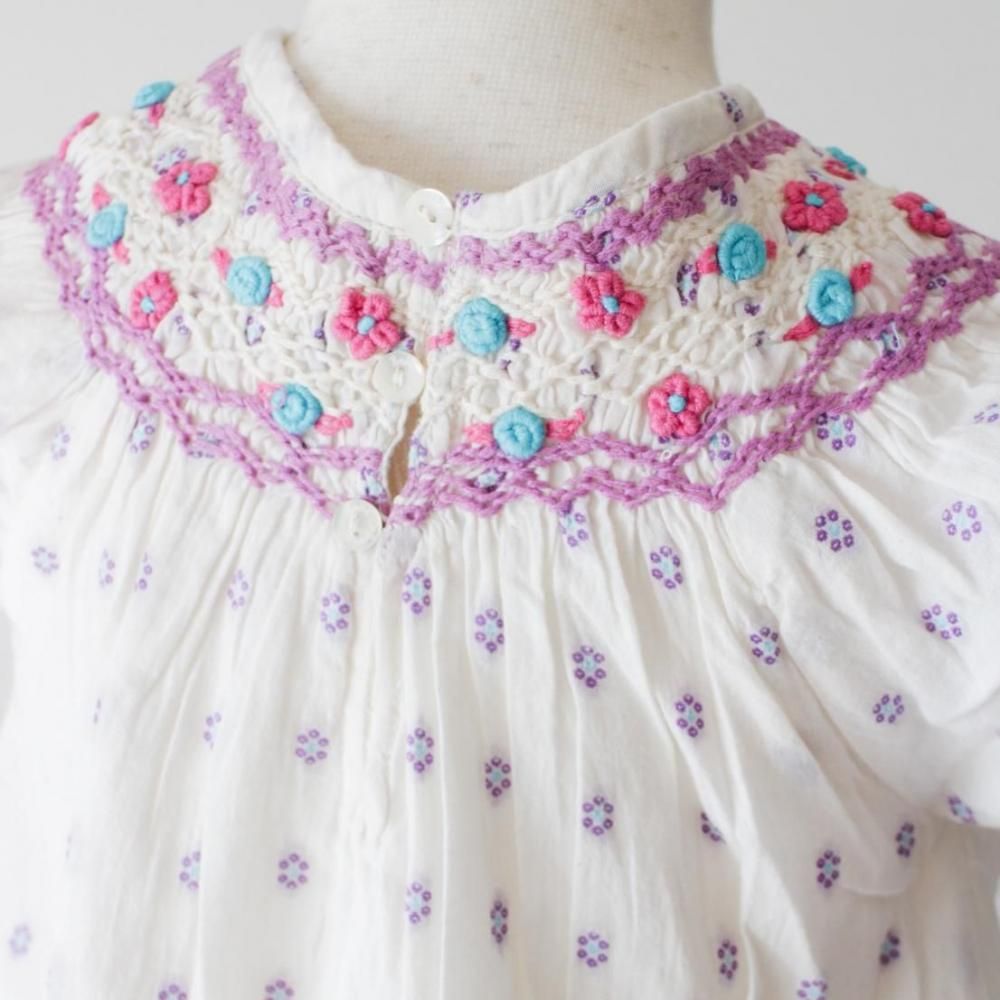 首周りのハンドスモッキングや花のモチーフが華やかな上下セット。首元後ろはボタン開閉仕様。上下ともに裏地付きです。