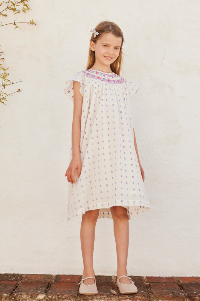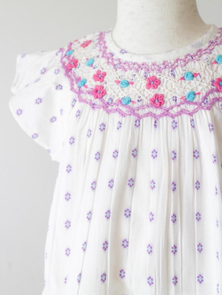 首周りのハンドスモッキングや花のモチーフが華やかなワンピース。裏地付きです。