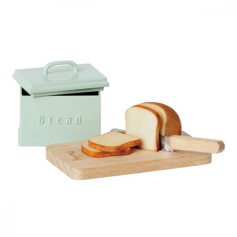 ミントグリーンのブレッドボックスはBreadの刻印入り。カットされた食パン、カッティングボード、ナイフ付きでMailegらしいこだわりが詰まった本格的なセットです。