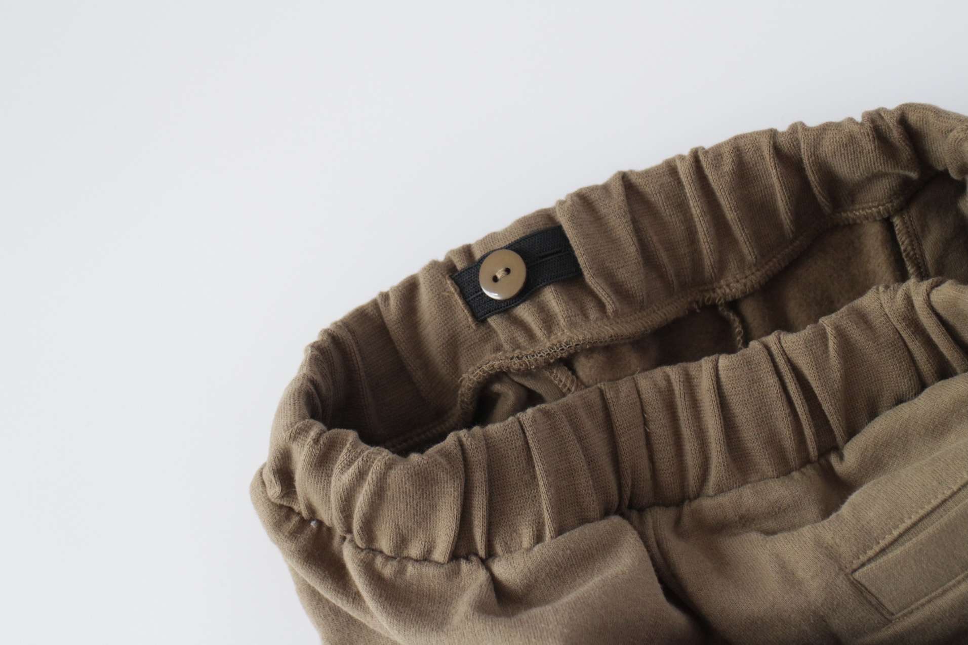 ウエスト調節用のゴム入り。ボタン位置でお好みの幅に調節が可能です。