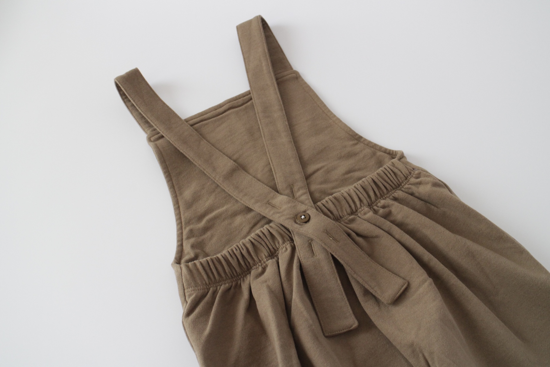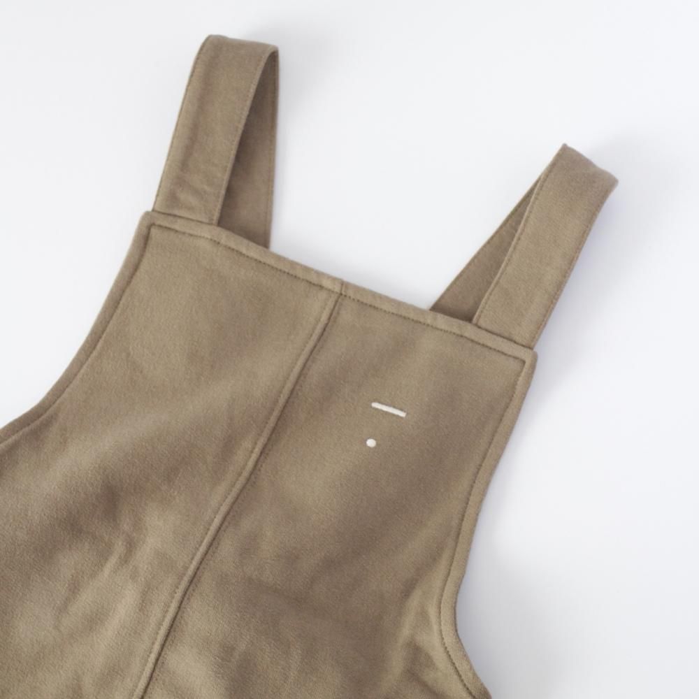 薄手でなめらかな触り心地のスウェット地のサロペット。ショルダーストラップはボタン位置で3段階の調節が可能です。